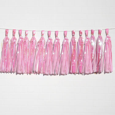 Pink Holographic Tassel Garland Set. Perfect for any occasion to hang in front of a table, in a row under a banner or with balloons.