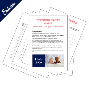 - Give each team a printed copy of the Answer Sheet or divide up if playing in a group. Once your guests have filled in the answers transfer them onto the Story Telling Sheet for a funny Birthing Story that someone reads out loud at the end!