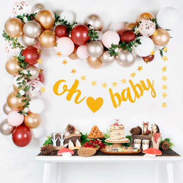 Party made easy. Create a warm, gender-neutral balloon garland featuring copper, gold and white, finished with soft greenery and an “Oh Baby” gold banner. This DIY kit is perfect for baby showers and includes everything you need to style a beautiful, welcoming balloon backdrop.