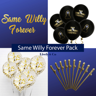 Our top selling banner is now available in a ready made pack, perfect for hens parties. Style the space with a statement Same Penis Forever banner and a mix of Gold Confetti Balloons and Same Penis Forever balloons to go with it. Complete with gold willy straws for the whole bride tribe.