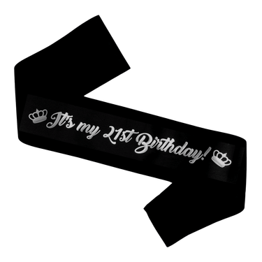 An elegant black satin sash with "It's my 21st Birthday" writing.