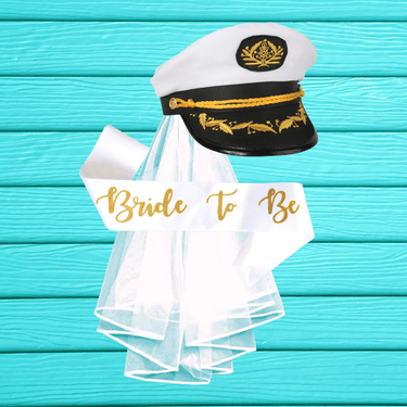 Comes with a captain's hat, separate white veil, and white sash with gold glitter writing "Bride to Be".