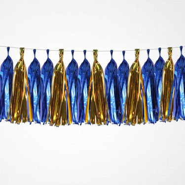 Metallic Deep Blue & Metallic Gold Tassel Garland Set. Perfect for any occasion to hang in front of a table, in a row under a banner or with balloons.